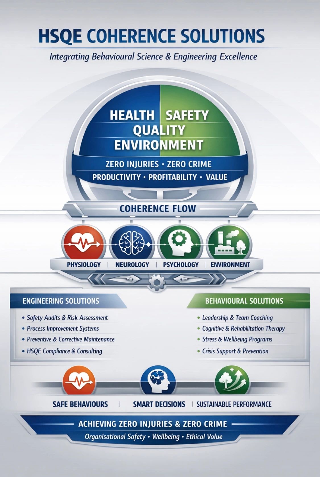 Create safe, healthy, high-performing organizations & communities by aligning behavioral science, engineering systems, and environmental design—achieving zero injuries, zero crime, and optimal wellbeing through HSQE excellence and operational excellence aiding coherent physiology-neurology-psychology flow.